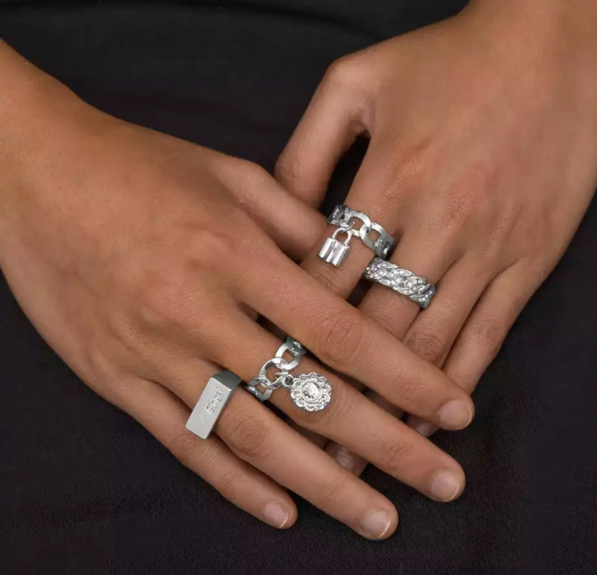Sett med 4 stk gøyale ringer. Her finner du ring med hengelås, blomst, bling og flat front.