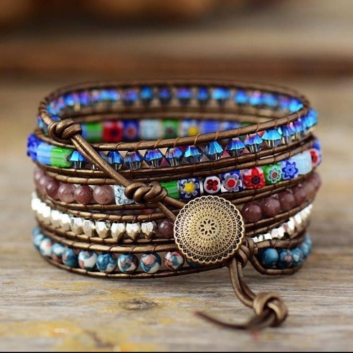 Håndlaget armbånd med justerbar lengde og høy blingfaktor. Dekorert med steiner og krystaller i en nydelig kombinasjon av ulike dype farger.
