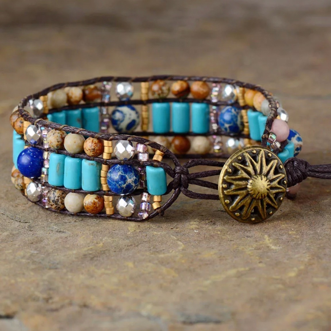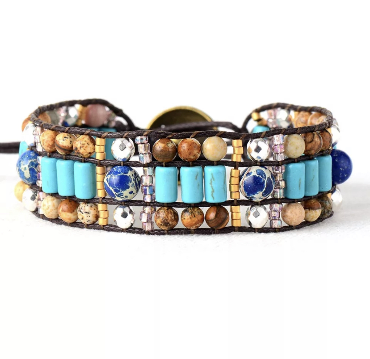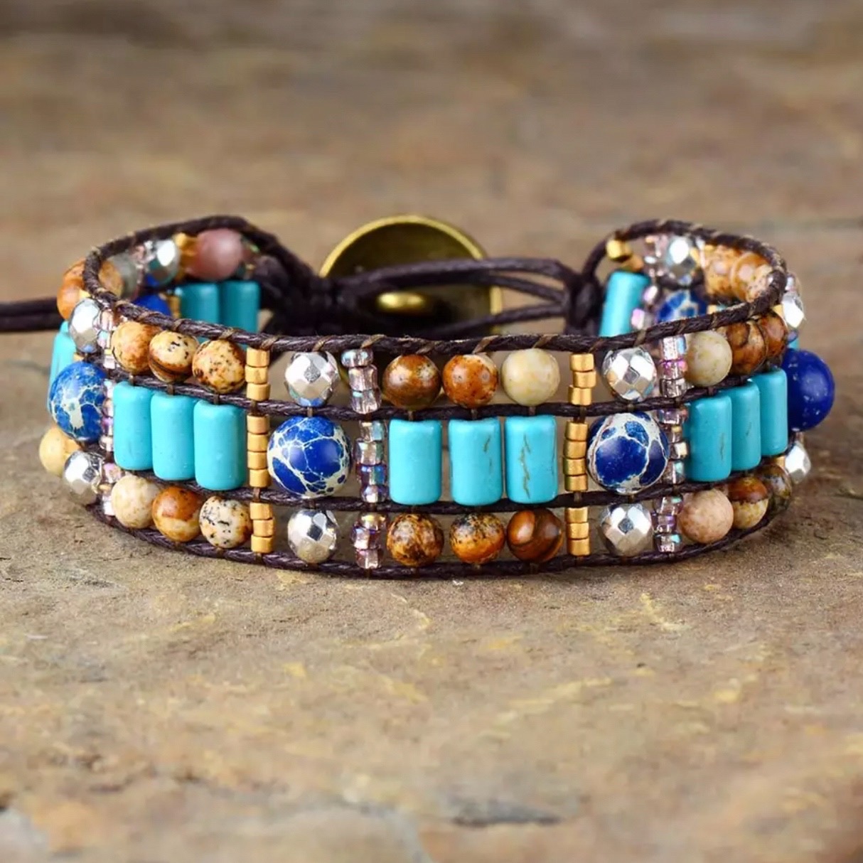 Materiale: Naturlige steiner i jasper og metallperler, skinnreimer