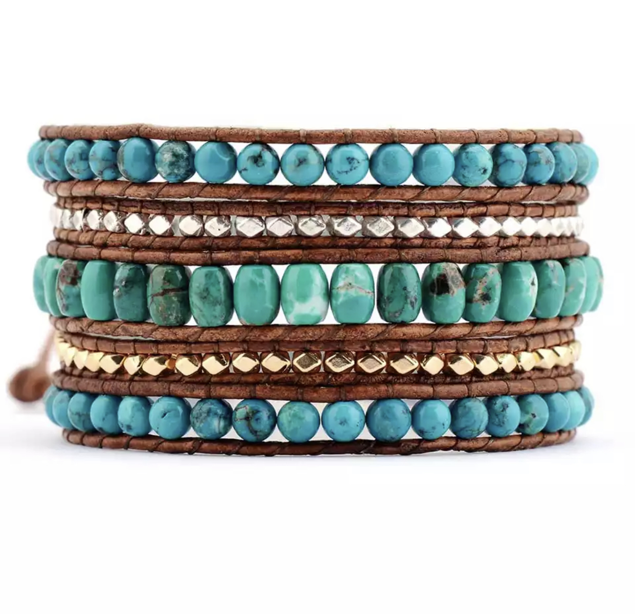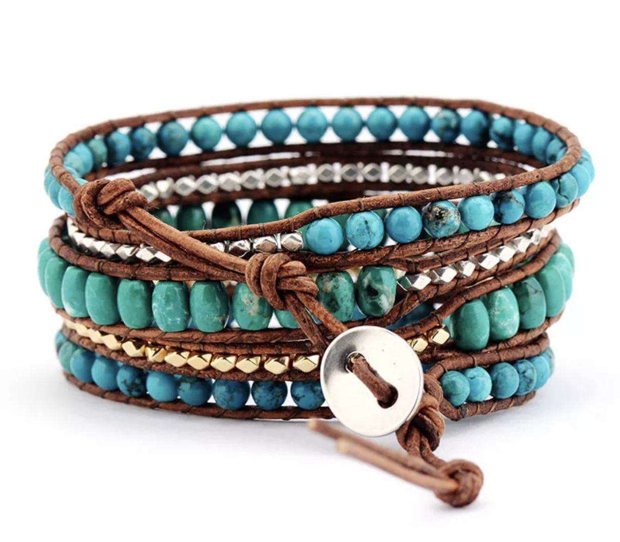 Materiale: Naturlige steiner i turqoise, metallperler, skinnreimer