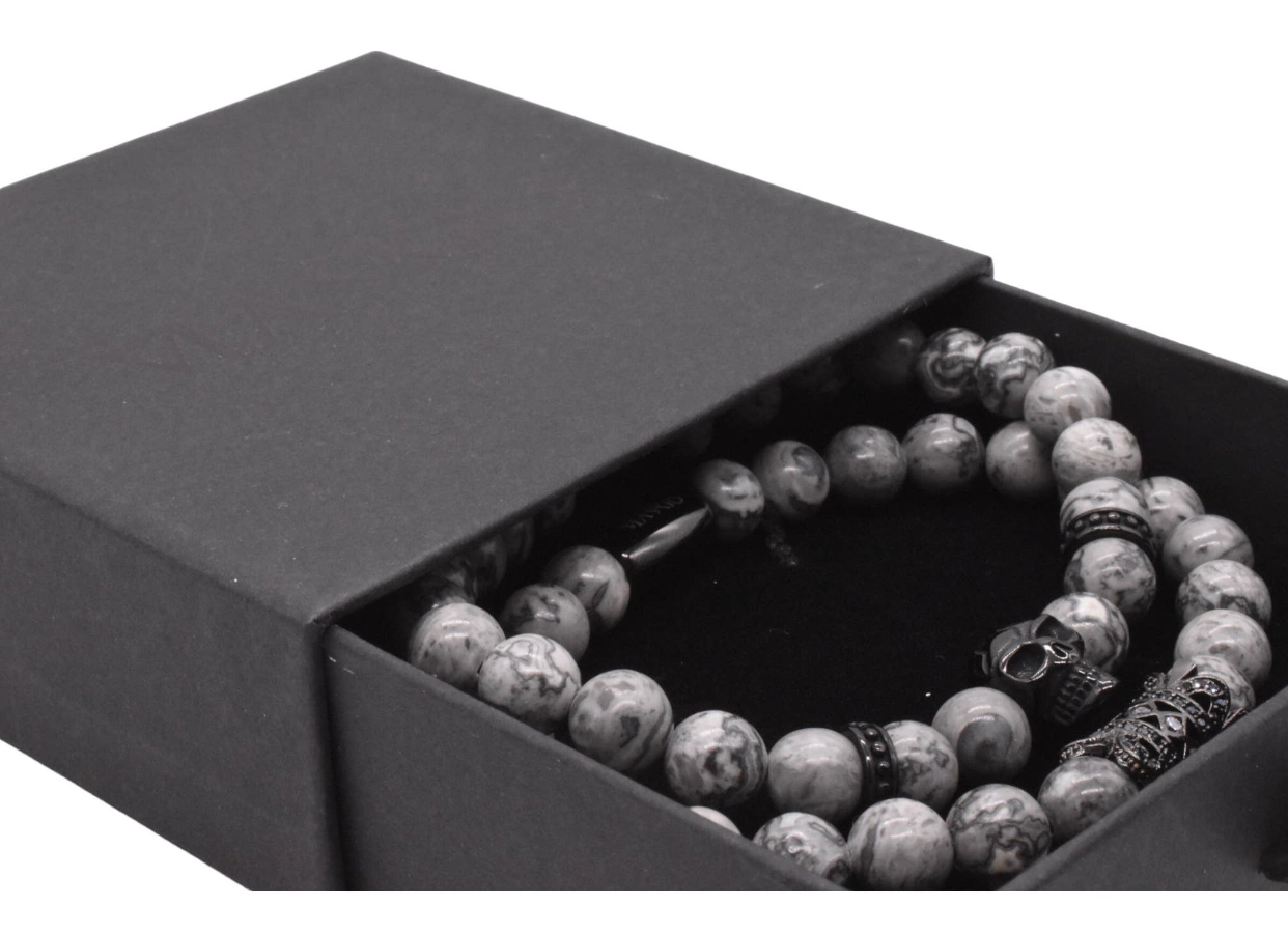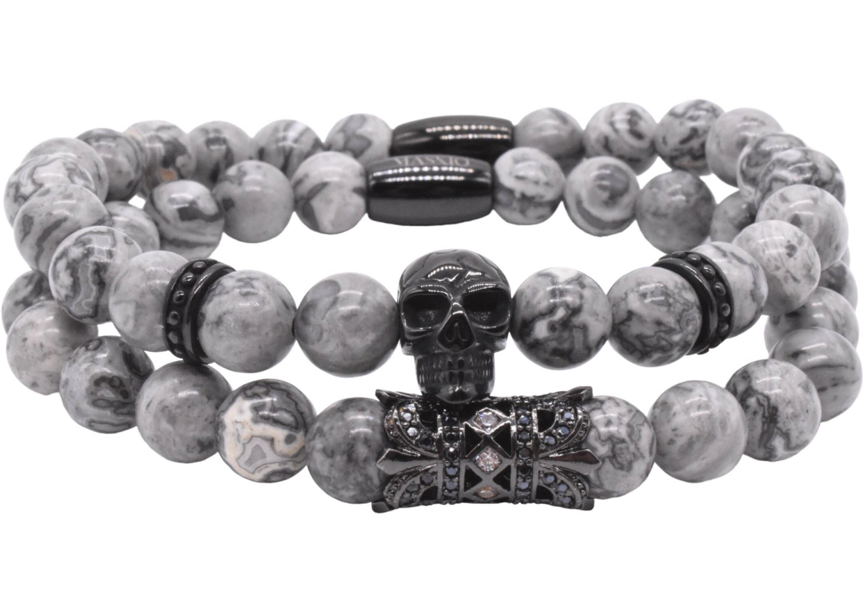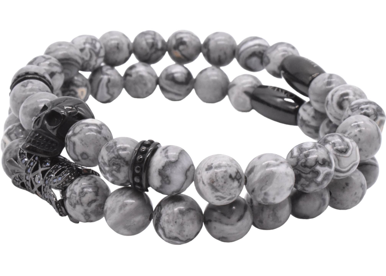 Dobbelt armbånd i lys Howlitt stein med skalle og dekor i rustfritt stål. Kan brukes hver for seg eller sammen og gjerne i kombinasjon med andre favoritter. Howlitt står for avslapping, tålmodighet og hukommelse.