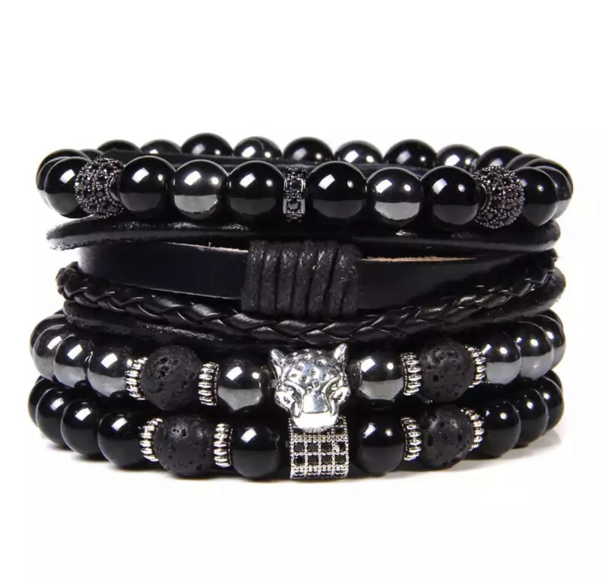 4 Håndlagede perlearmbånd med naturlige steiner, metallperler og skinn. Kan brukes sammen eller hver for seg. Justerbare og flotte til enhver anledning.