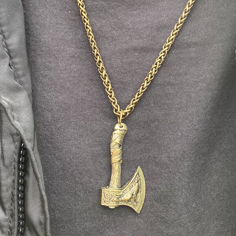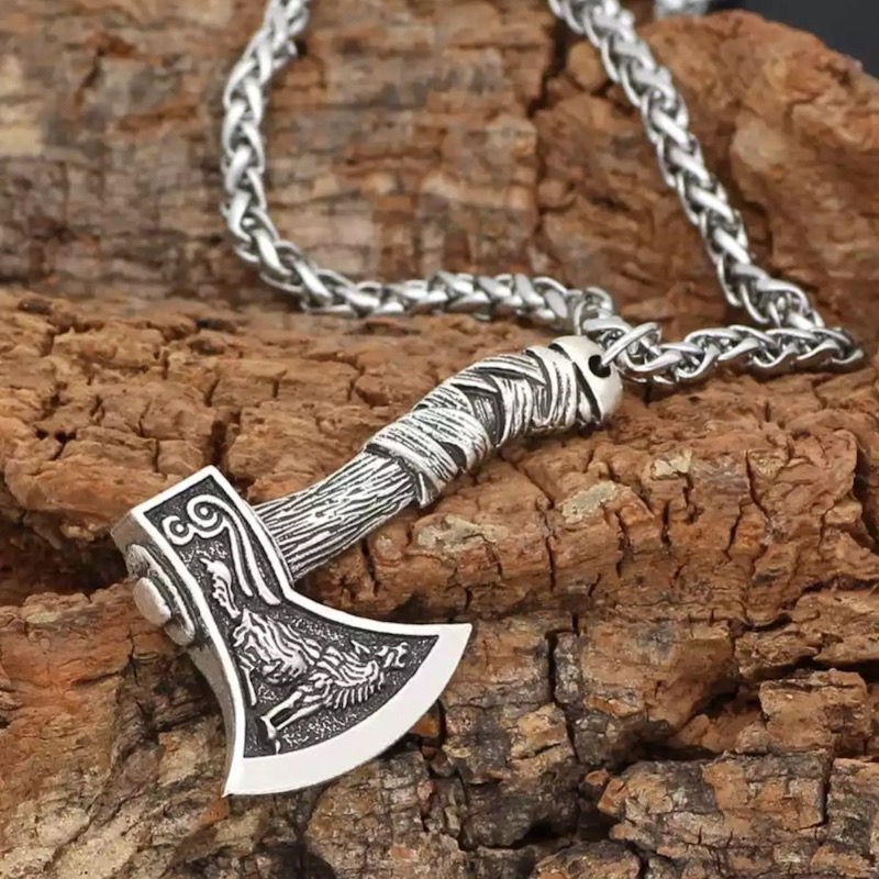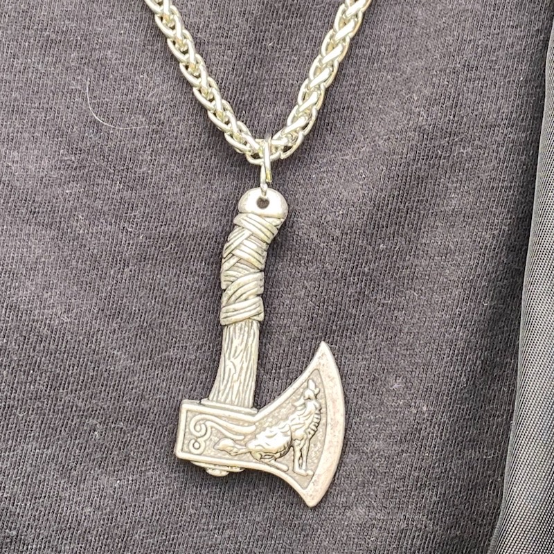 Halskjede i metall, anheng vikingøks med ulv og fugl