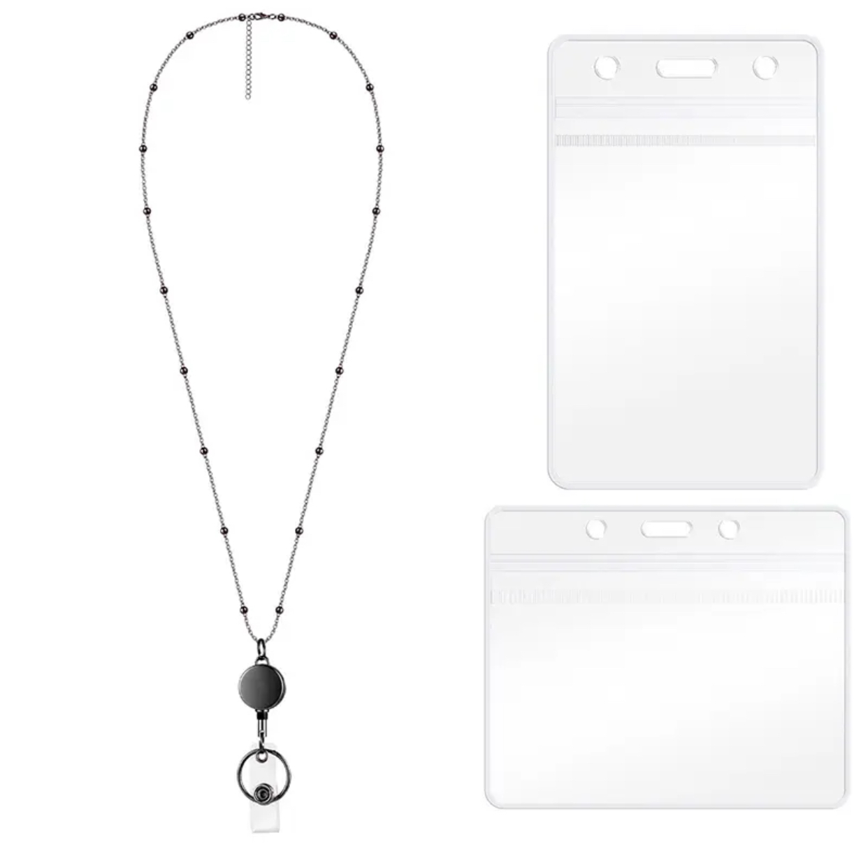 - Dekorativt kjede til ID-kort i blankt eller svart metall.