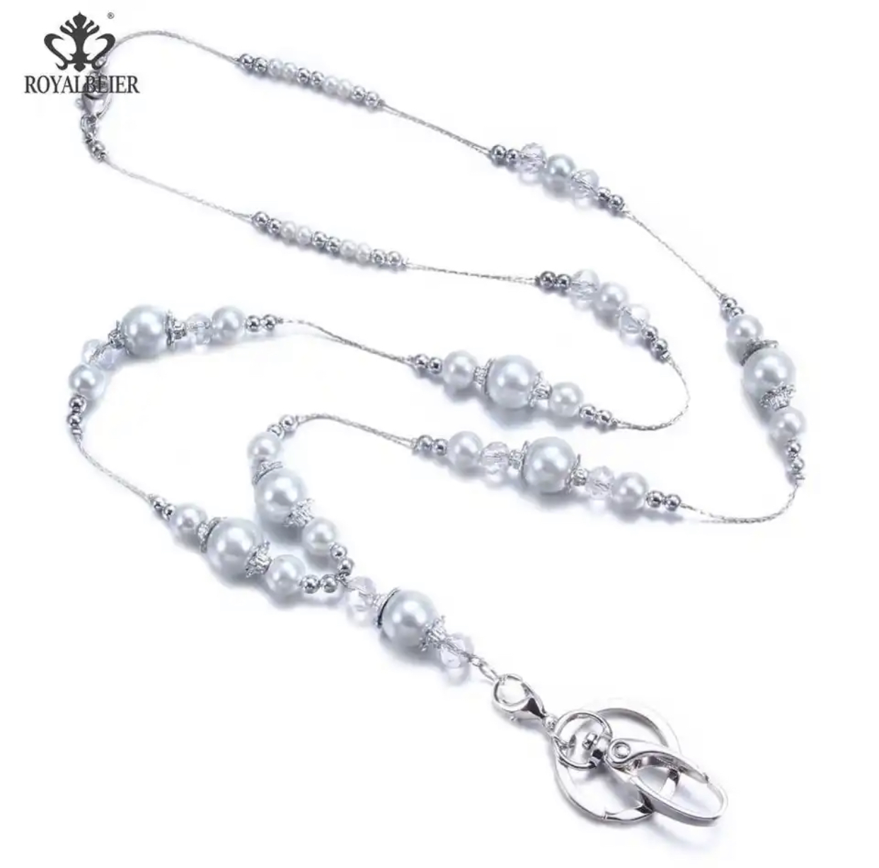 Dekorativt kjede til nøkkel- og id kort i blankt metall dekorert med hvite, metallfargede og blanke perler og dekor. Det lille og praktiske ekstra.