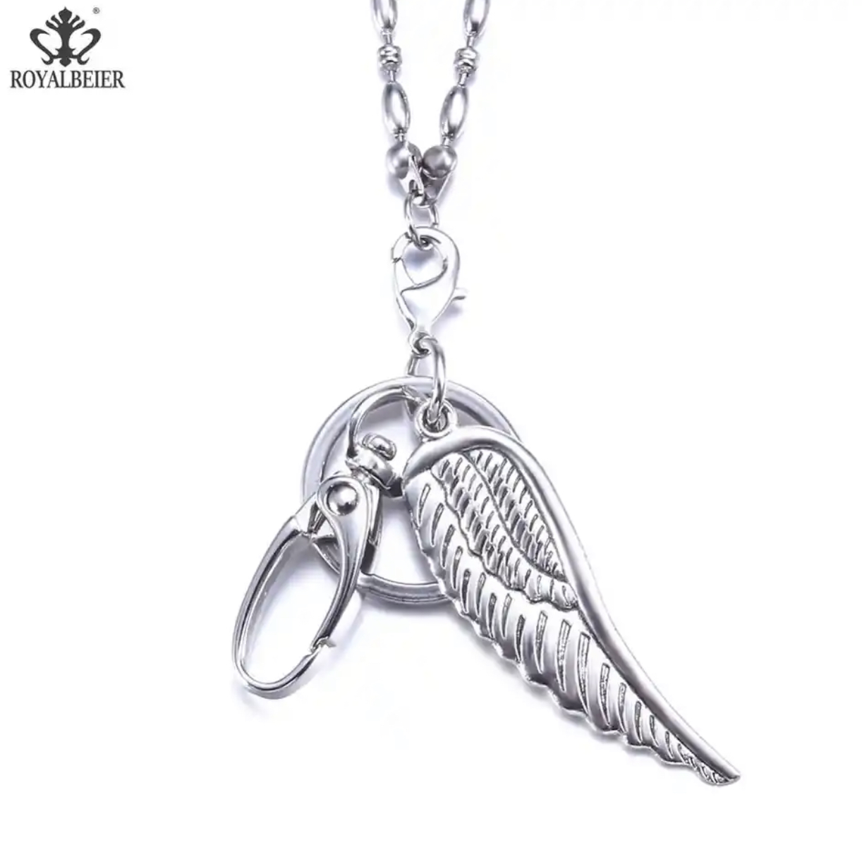 Dekorativt kjede til nøkkel- og id kort i blankt metall. Kjedet ser ut som metallperler og anheng med en vinge. Det lille og praktiske ekstra.