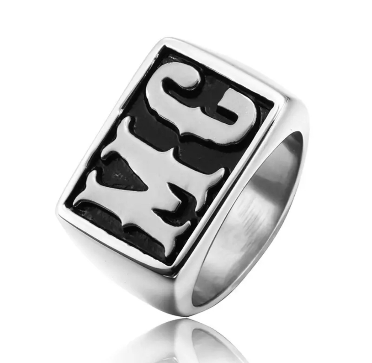 MC ring i rustfritt stål. Blankt metall med svart bakgrunn bak pregede bokstaver.