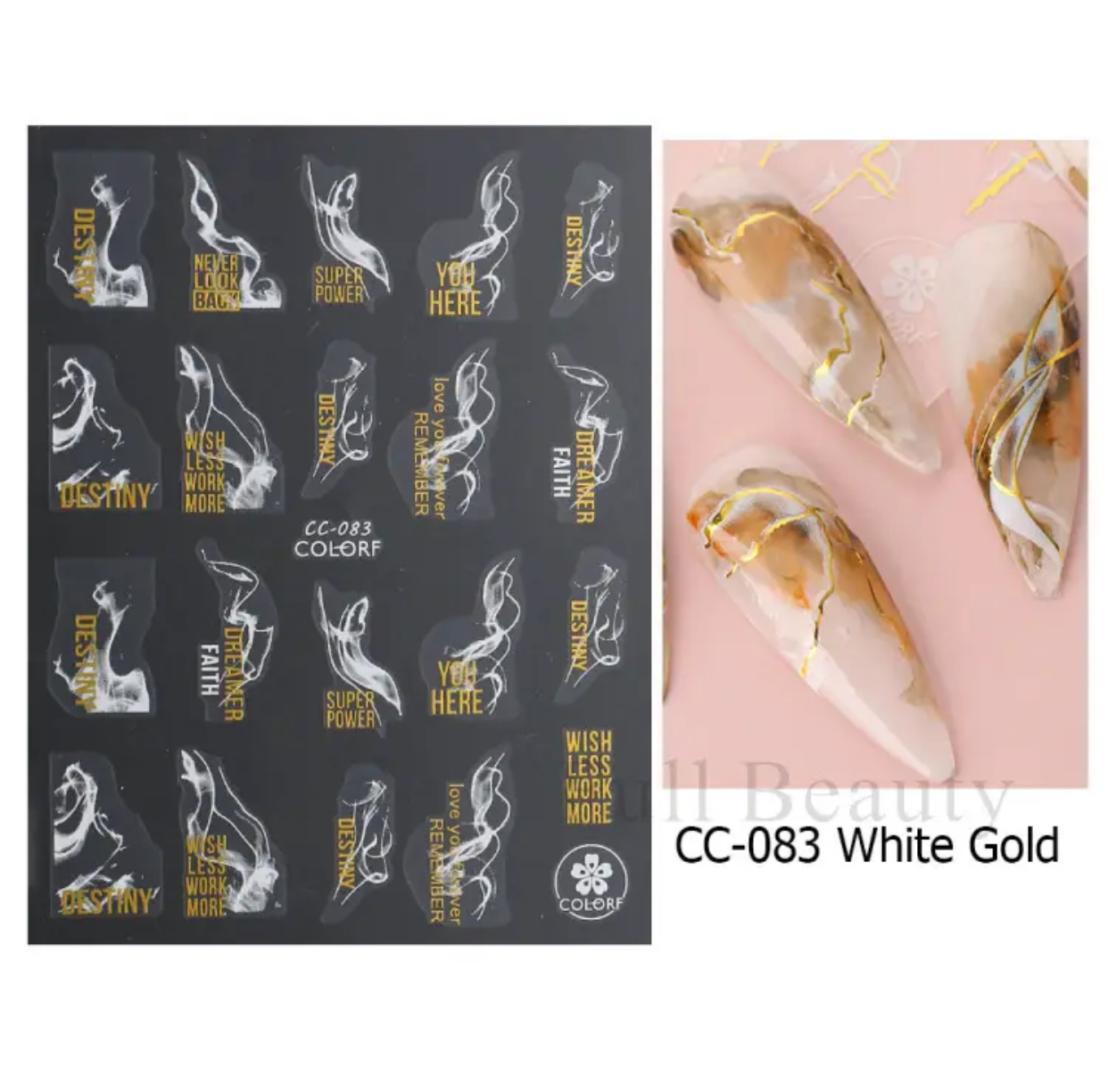 Gullord i hvit tåke – dekorative neglestickers med motiverende ord. Kan legges på neglelakk, shellac, gele og akryl.