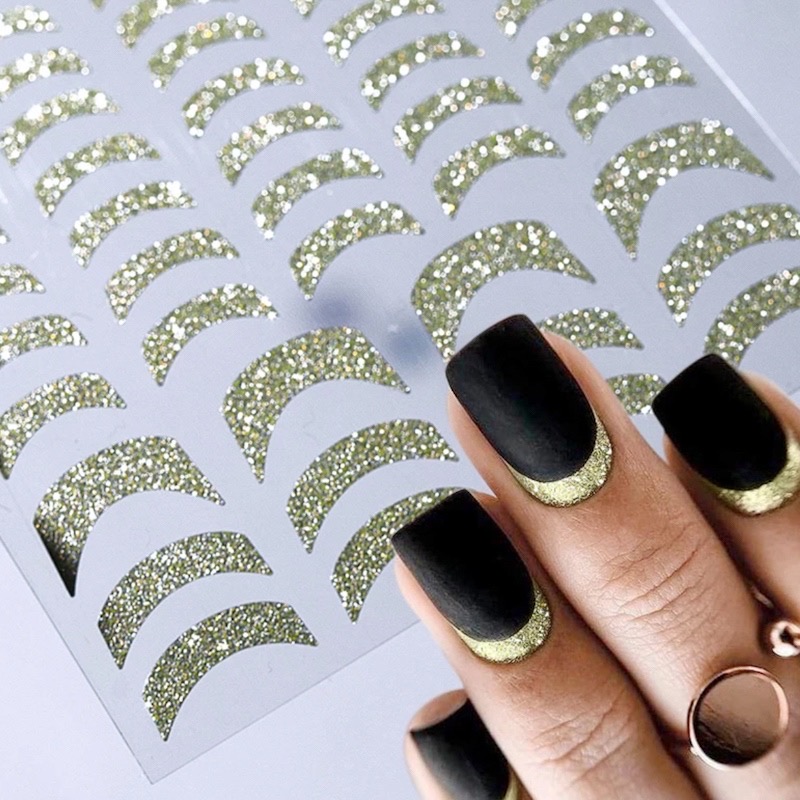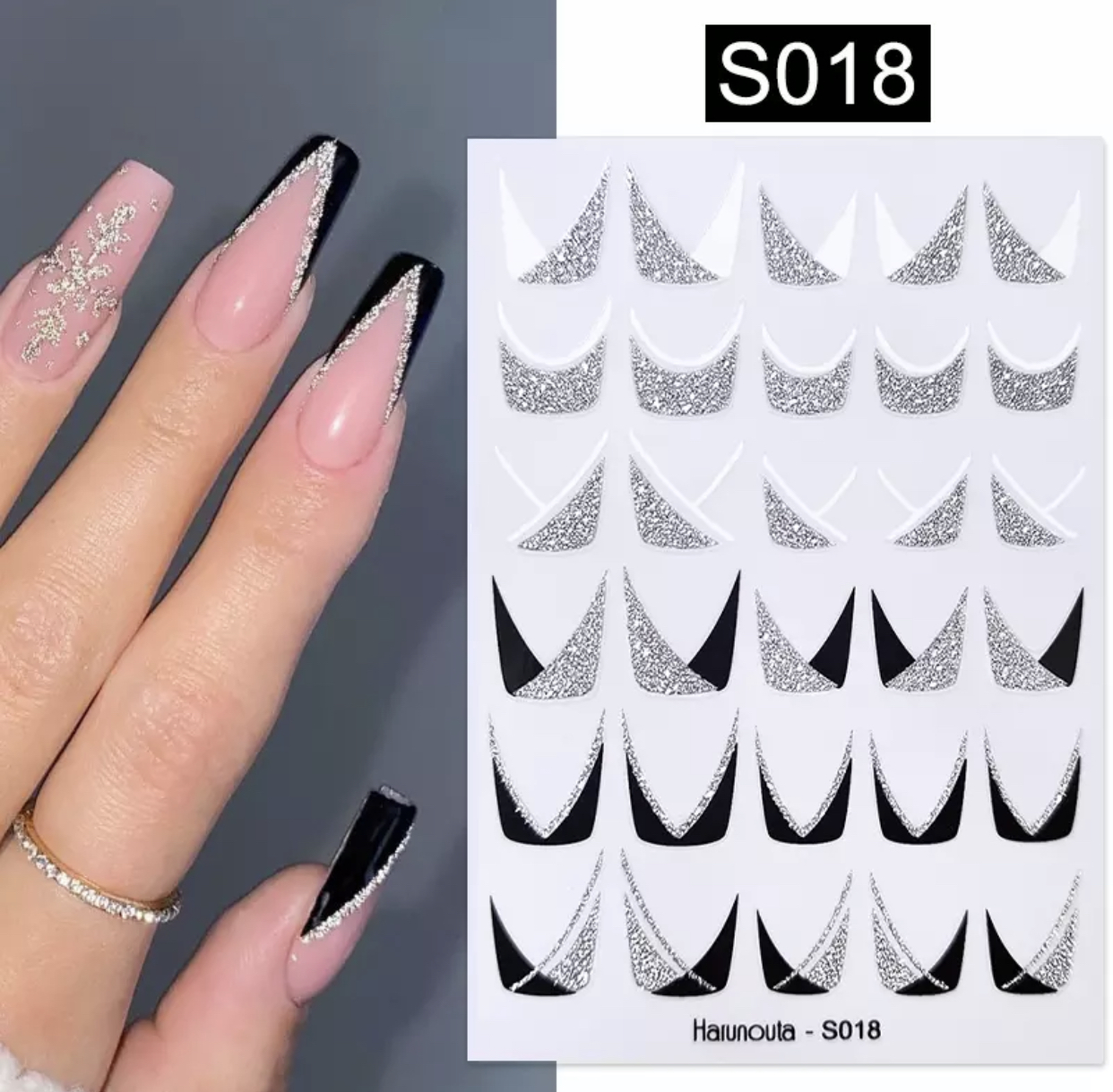 Pynt neglene litt ekstra neglestickersene i svart og sølvglitter. Kan legges på neglelakk, shellac, gele og akryl. Gjør det lille ekstra.