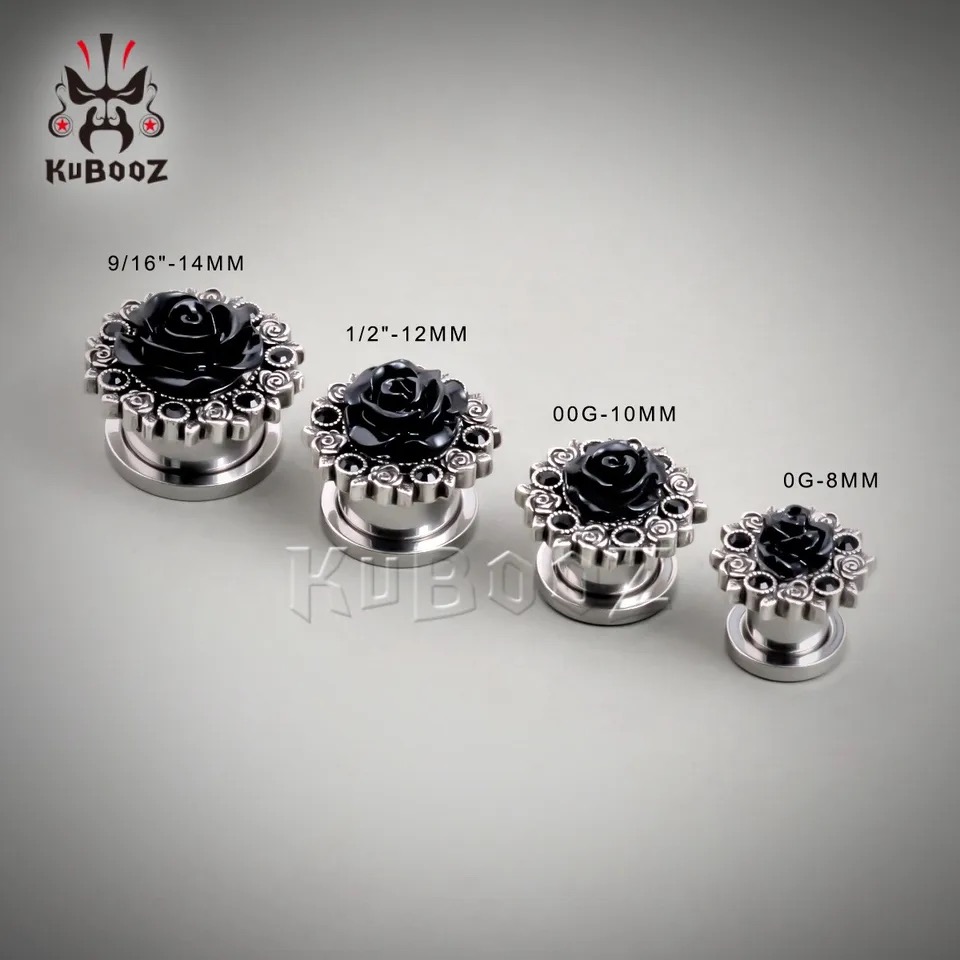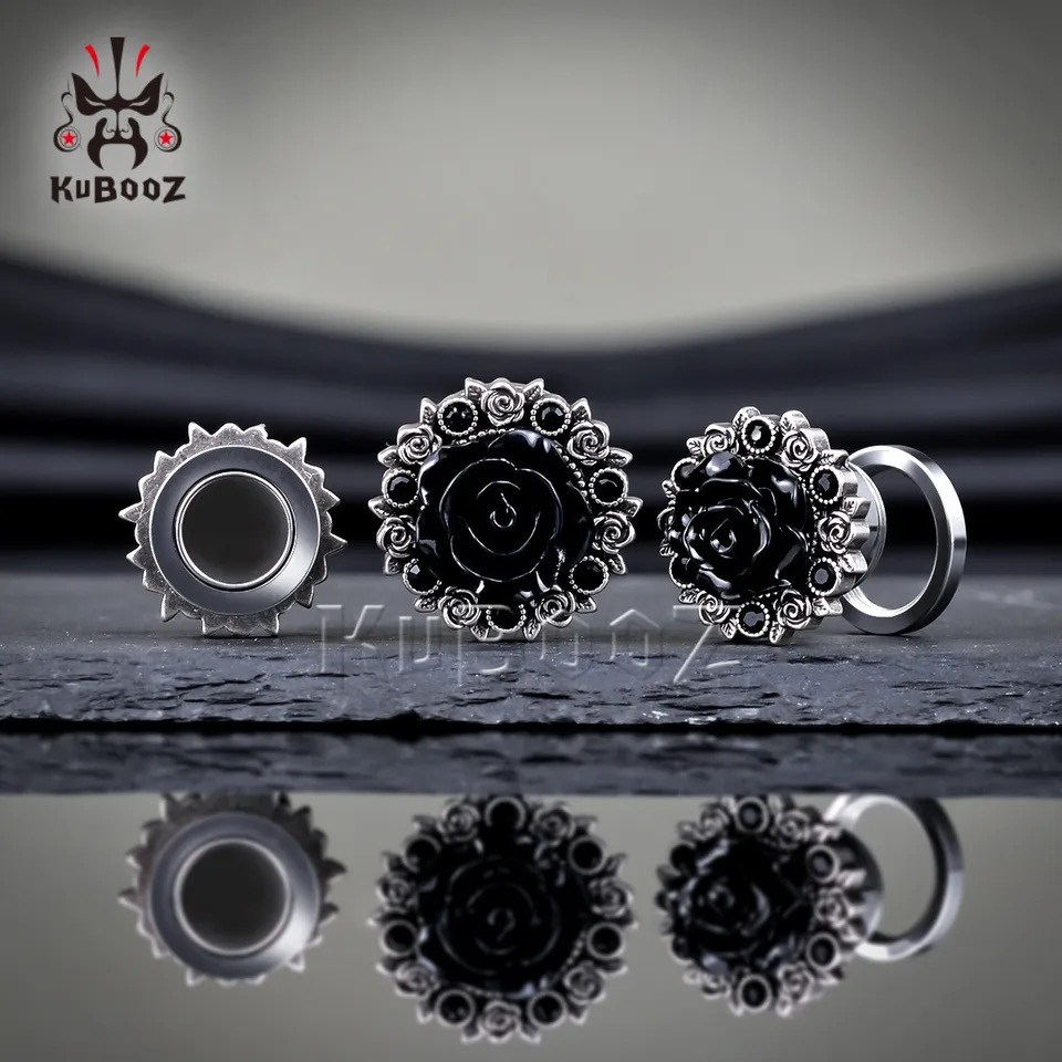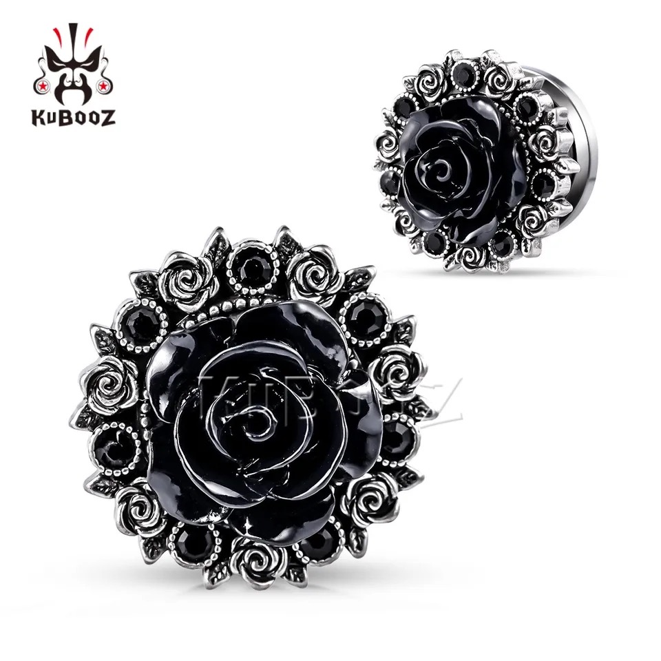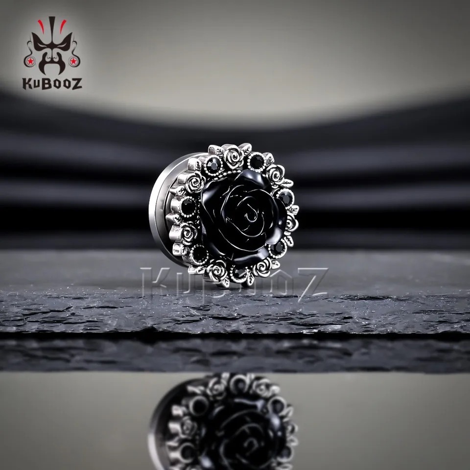 Øreplugg med svart rosedekor. Dekorativ øretunnel i rustfritt stål. Tøff øreplugger for deg som ønsker å ha noe litt utenom det vanlige. Selges som par.