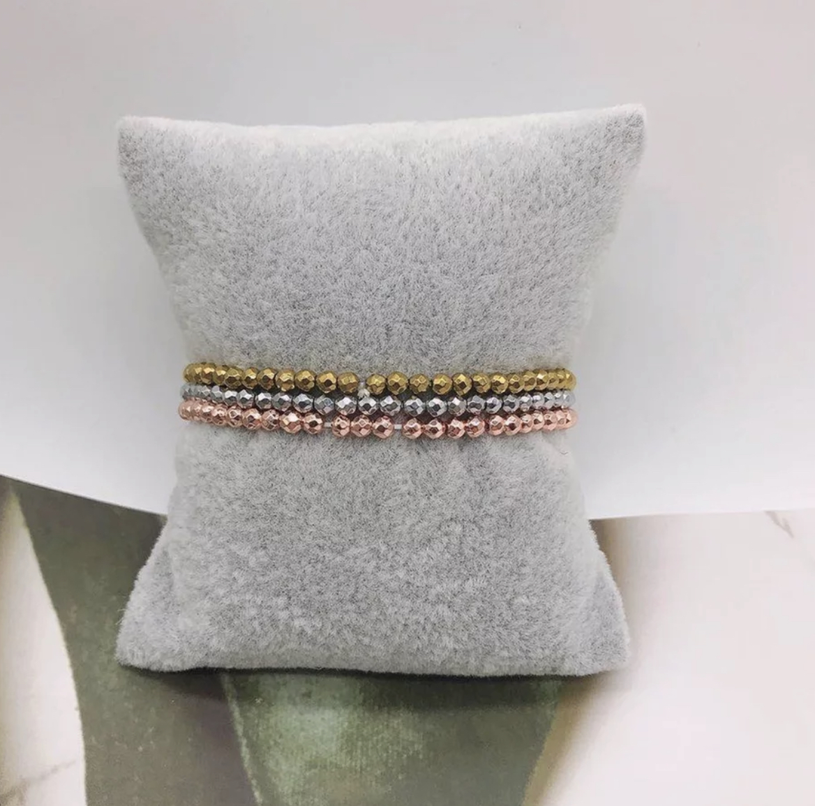 6 ulike perlearmbånd i glassperler – kan brukes sammen eller hver for seg. Justerbare og 1 med strikk