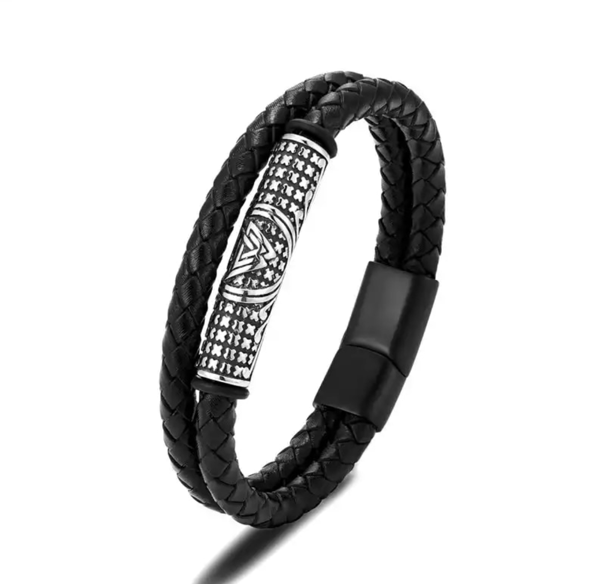 Svart lærarmbånd med 2 reimer dekor i rustfritt stål – Vikingstil.