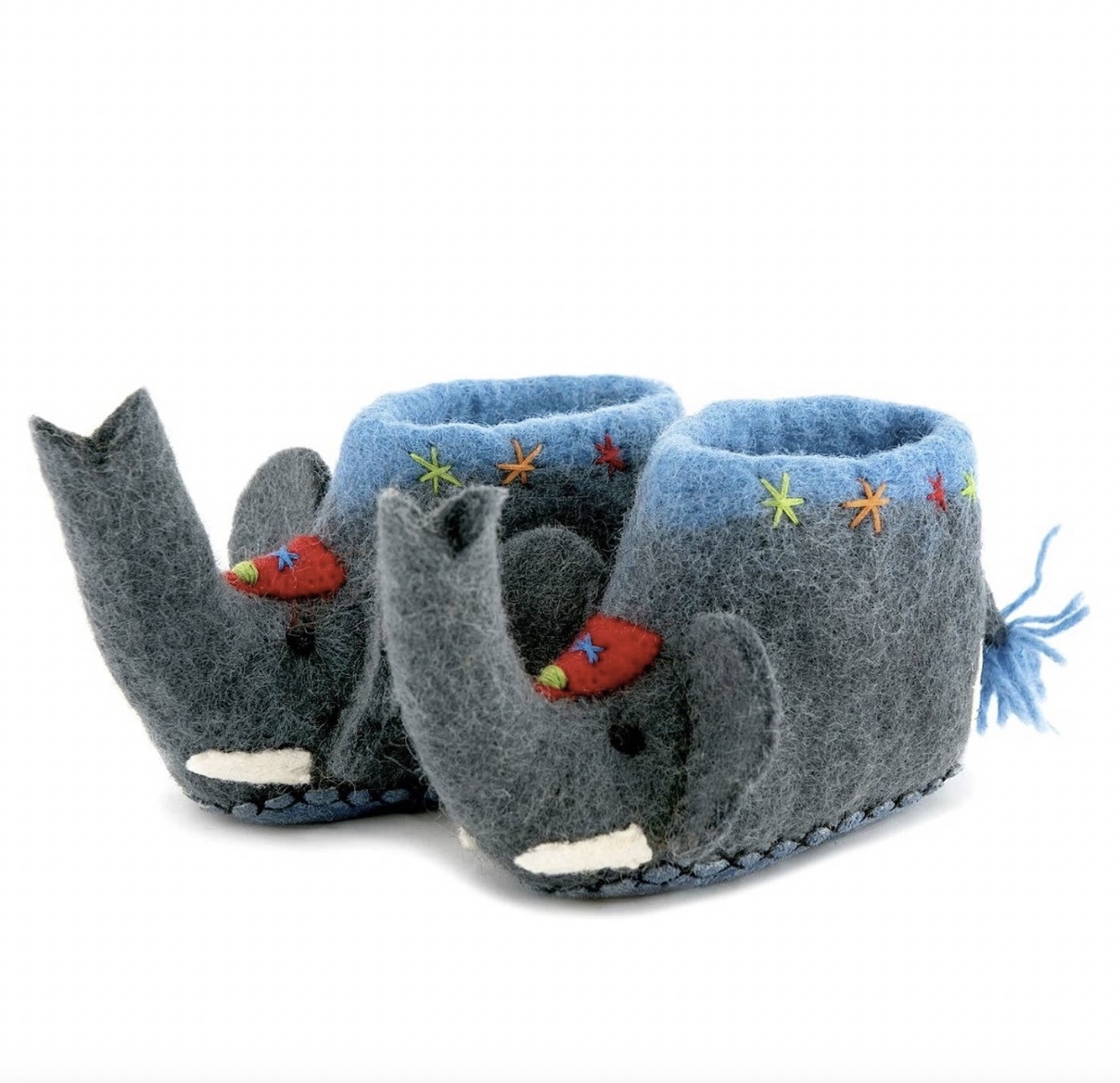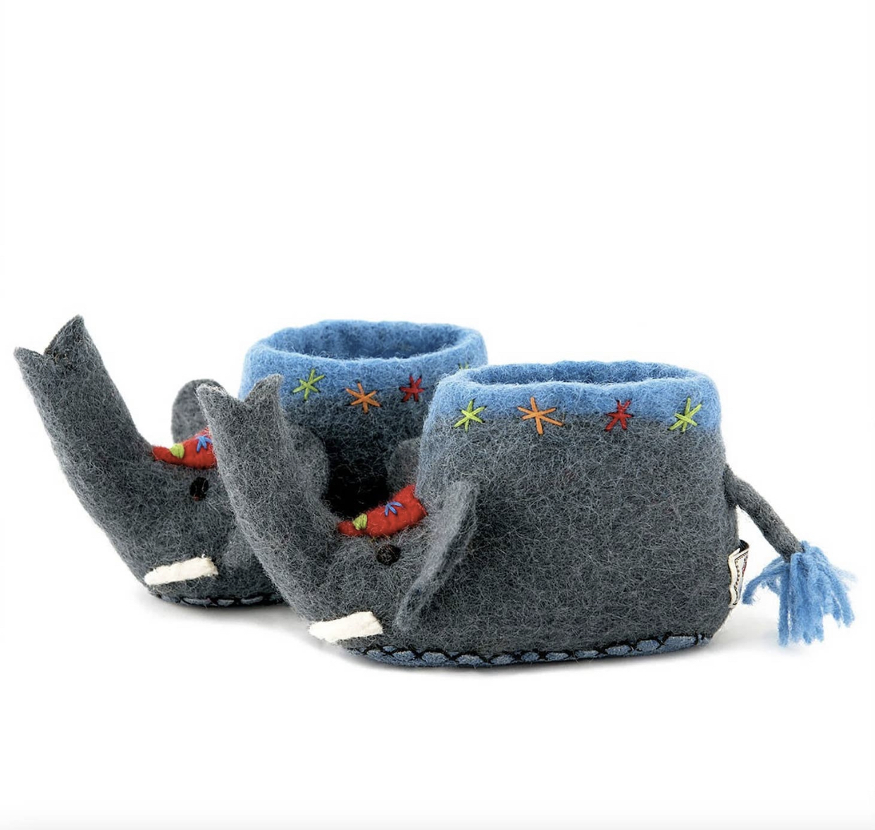 Håndlagede tøfler av organisk, hudvennlig filt og håndsydde anti-skli såler.