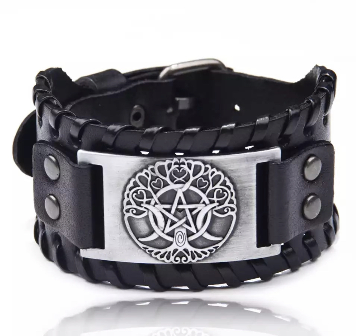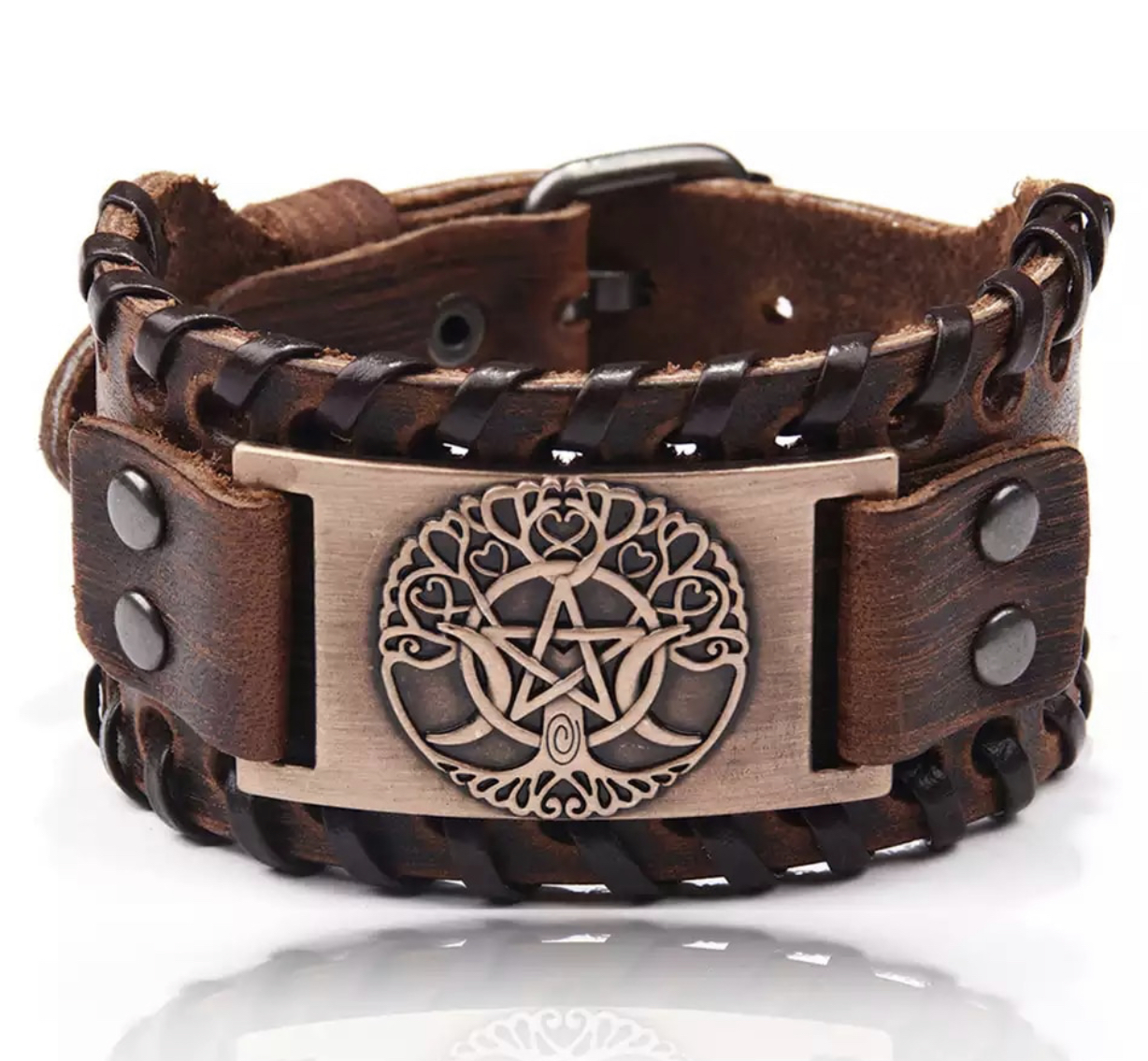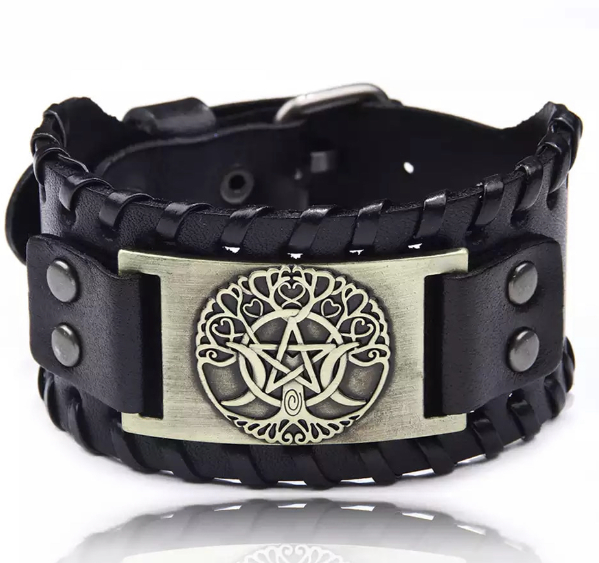 Vikingarmbånd i ekte skinn med metallplate – Livets tre