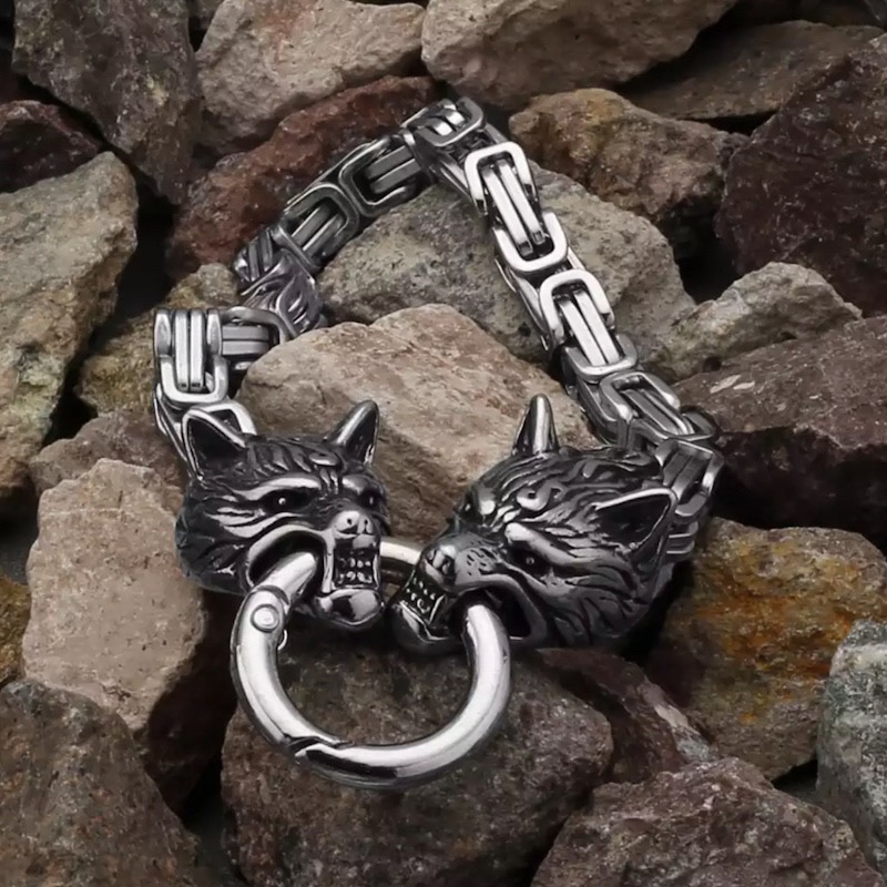 Armbånd i rustfritt stål med dobbelt ulvehode.